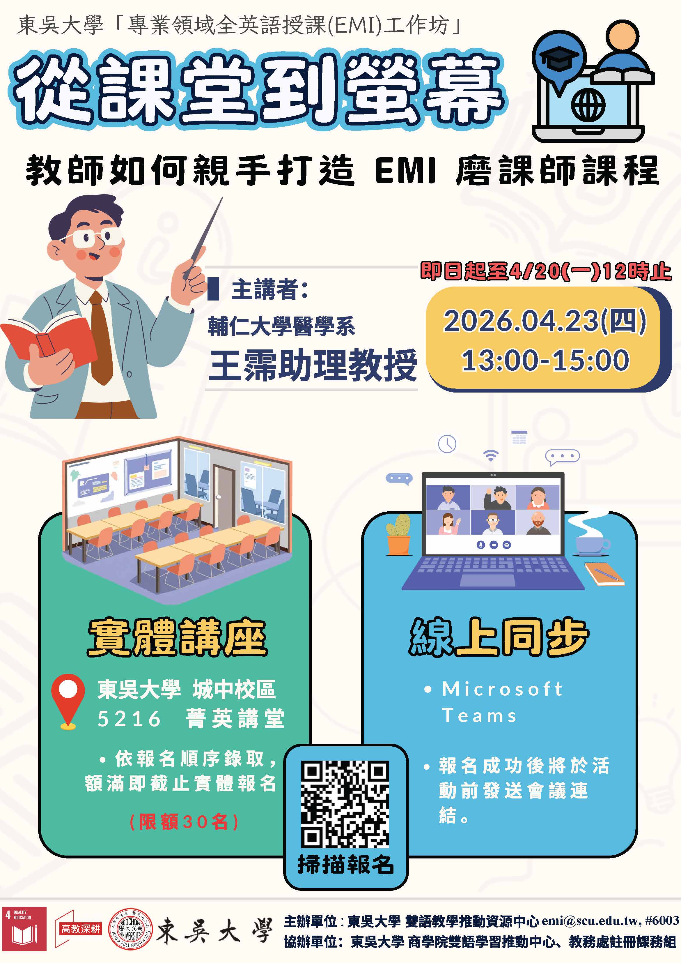 東吳大學於115年4月23日辦理「專業領域全英語授課(EMI)工作坊」