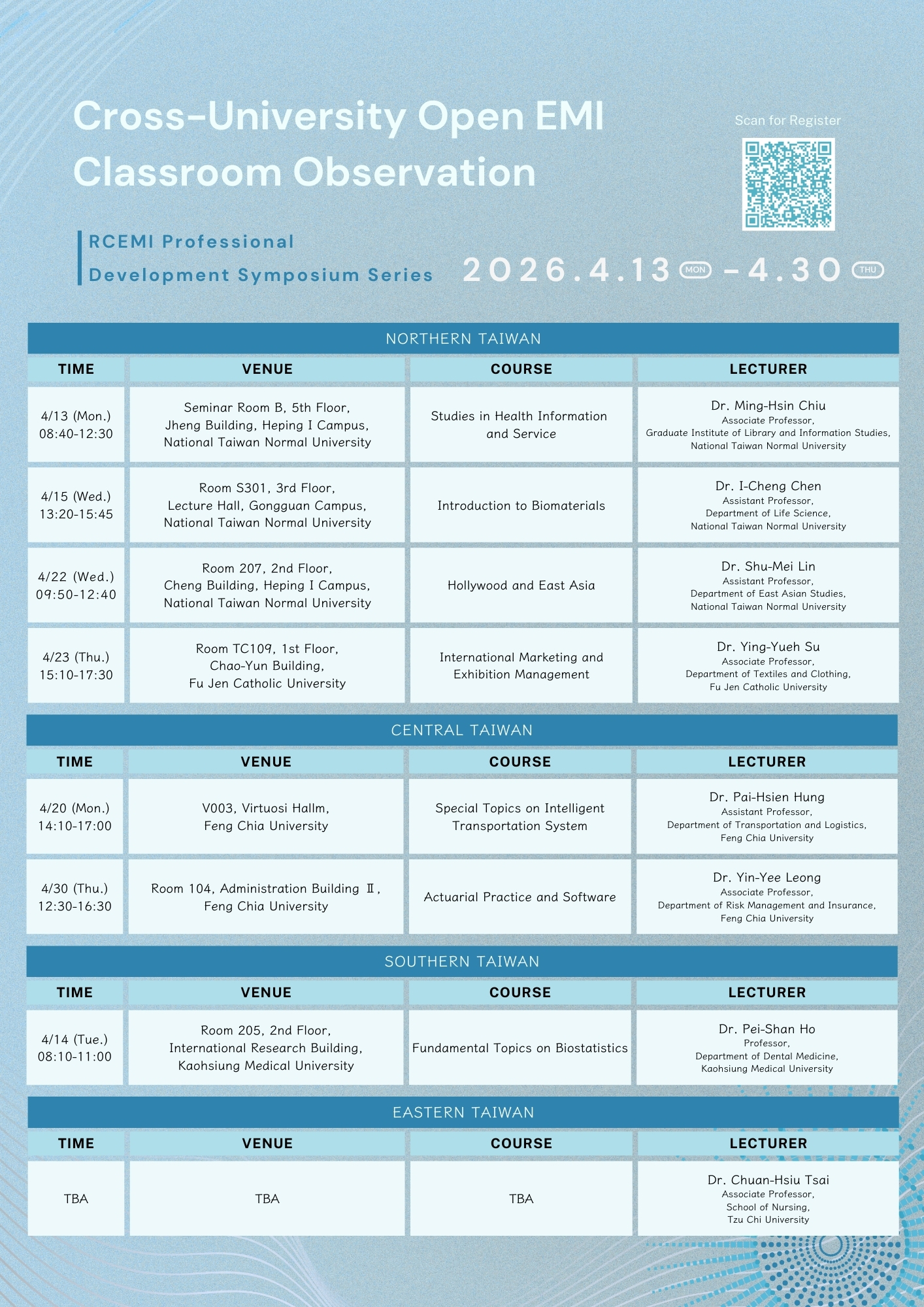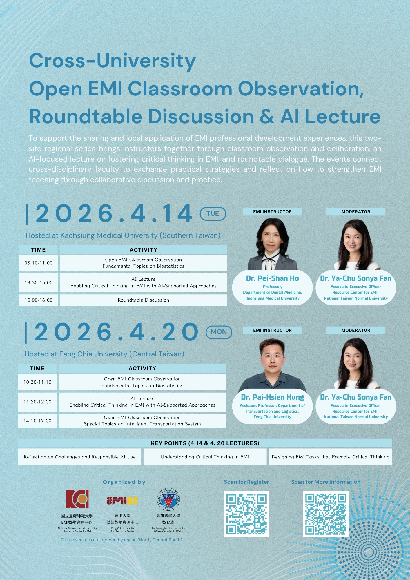 跨校公開觀議課:邀請本中心曾於2025年暑期赴美國德州大學奧斯汀分校,以及於2026年赴澳洲新南威爾斯大學參與培訓並返臺之EMI教師公開展示課堂,提供EMI教師具體之教學示範與實務參考。各場次皆邀請相關專家學者擔任與談人,於課後進行觀議與交流,共同探討EMI教學設計、課堂實踐及教學品質精進之可能方向。