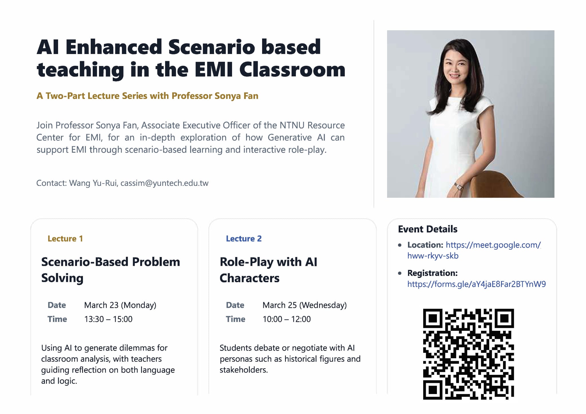 第一場:115年3月23日(星期一)下午1時30分至3時,主題為「Using AI to generate dilemmas for classroom analysis, with teachers guiding reflection on both language and logic。
