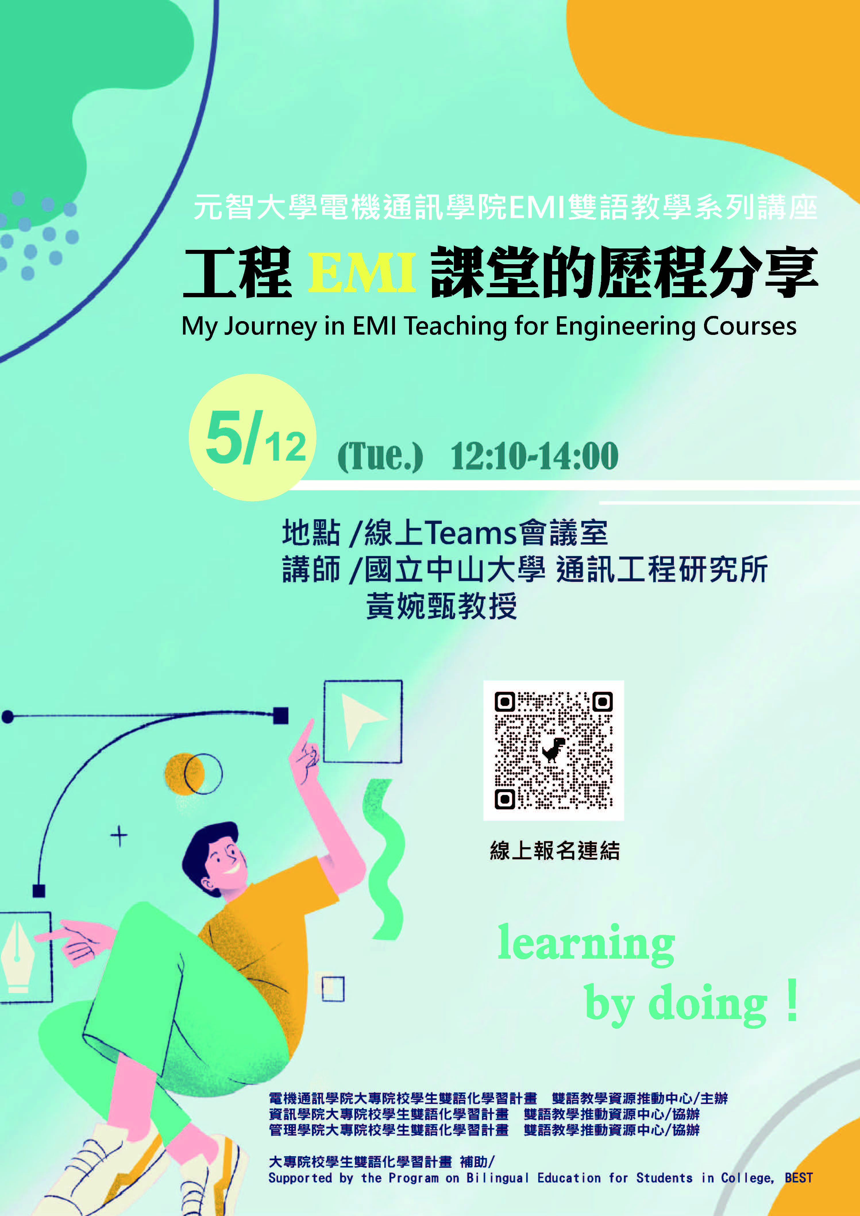 為增進EMI課程教學技巧,並提升教師EMI教學能力,本校電機通訊學院於114學年度第2學期辦理「EMI雙語教學系列講座」,歡迎各大專校院教師報名參與。