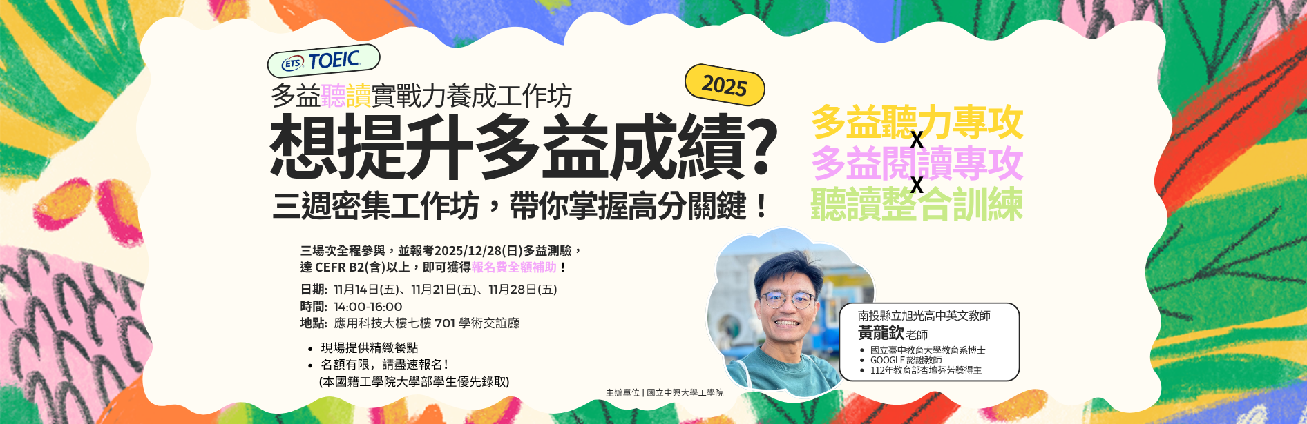 The College of Engineering invites Mr. Huang Lung-Chin, English teacher at Nantou County Shiukuang Senior High School , to share his extensive teaching experience and test-preparation strategies. Mr. Huang will provide in-depth analysis of TOEIC listening and reading question types, helping students grasp the key techniques to achieve a high score.
