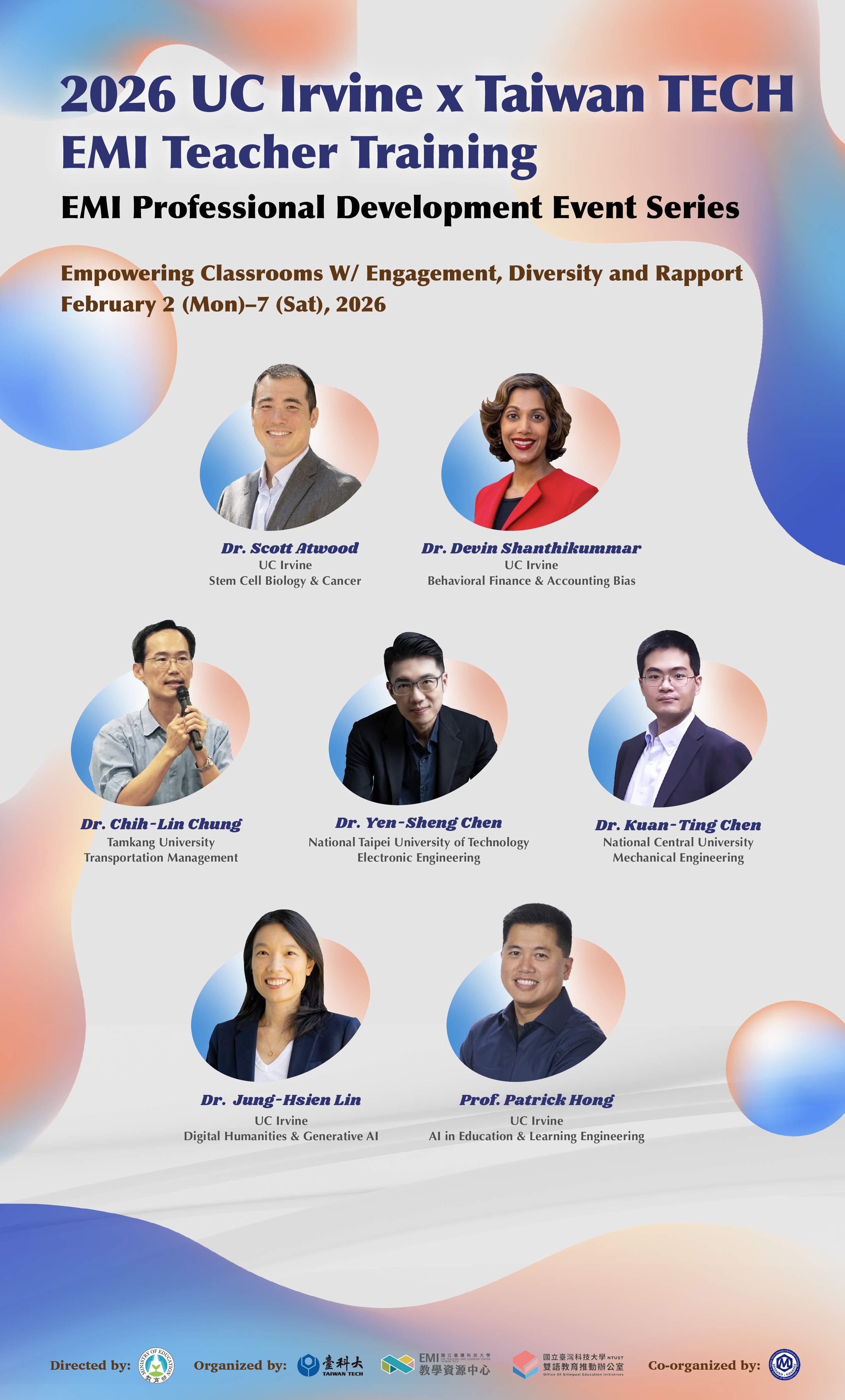 本校EMI教學資源中心(以下簡稱本中心)配合2030雙語政策及大專校院推動EMI課程,於113年正式成立。結合技職院校與一般大學之實務教學特色,並提供各大專校院教學之資源,此次本中心與UC Irvine教學團隊聯手舉辦EMI教師培訓活動,以推動各大專校院EMI教師教學知能培訓,期望達到EMI教師教學增能之目的,並透過資源中心資源共享,合作共好之理念。