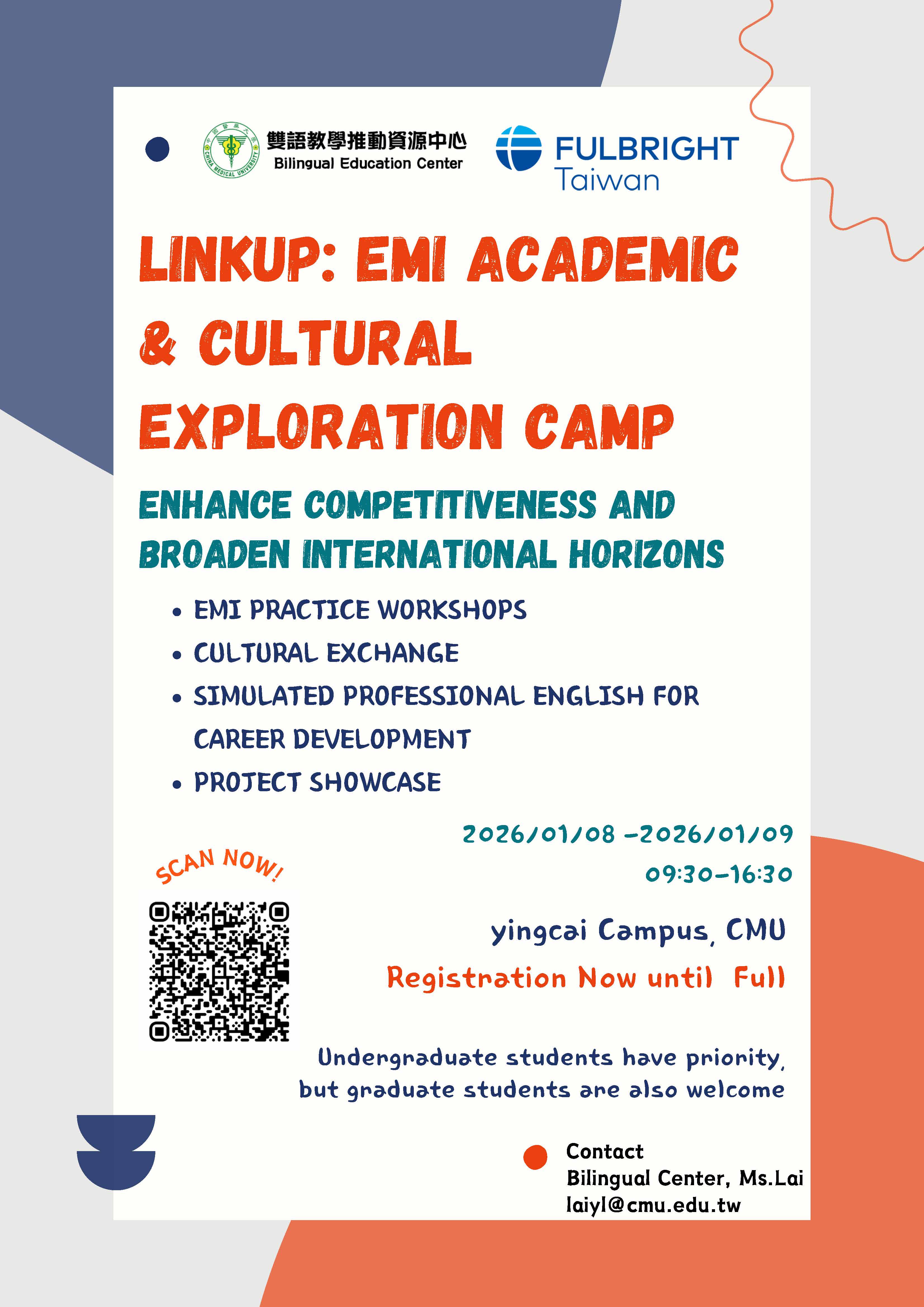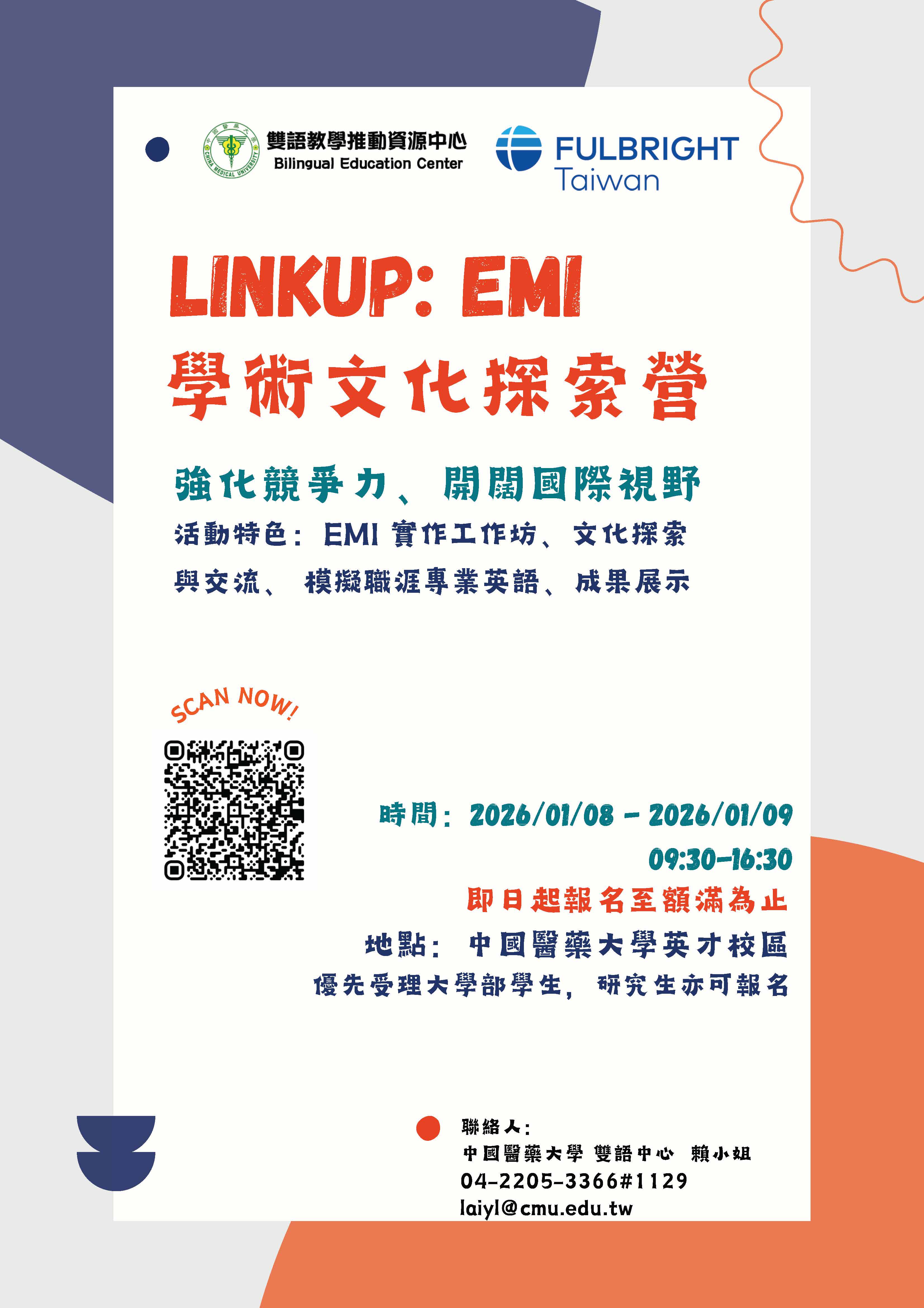 聯絡資訊:雙語中心賴小姐,連絡電話:(04)2205-3366分機1129,Email: