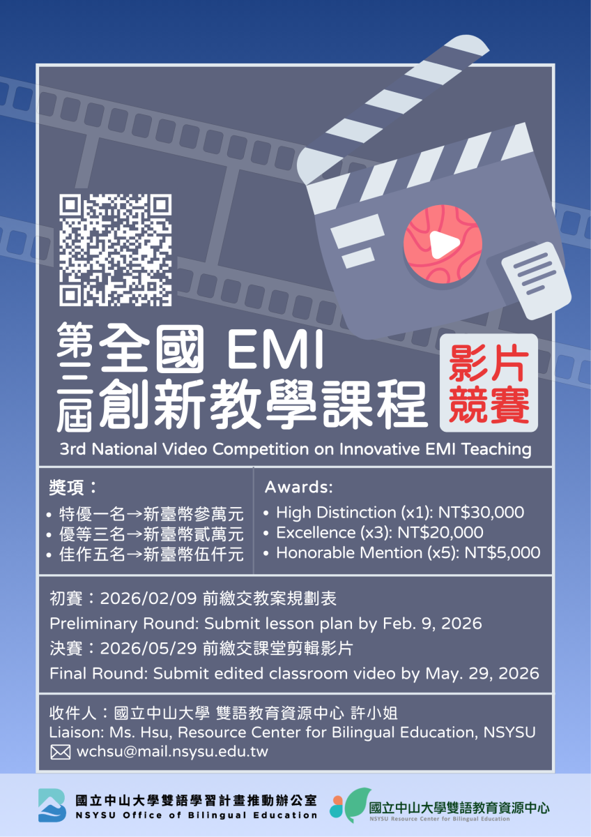 國立中山大學「第三屆全國EMI創新教學課程影片競賽」【延長徵件】